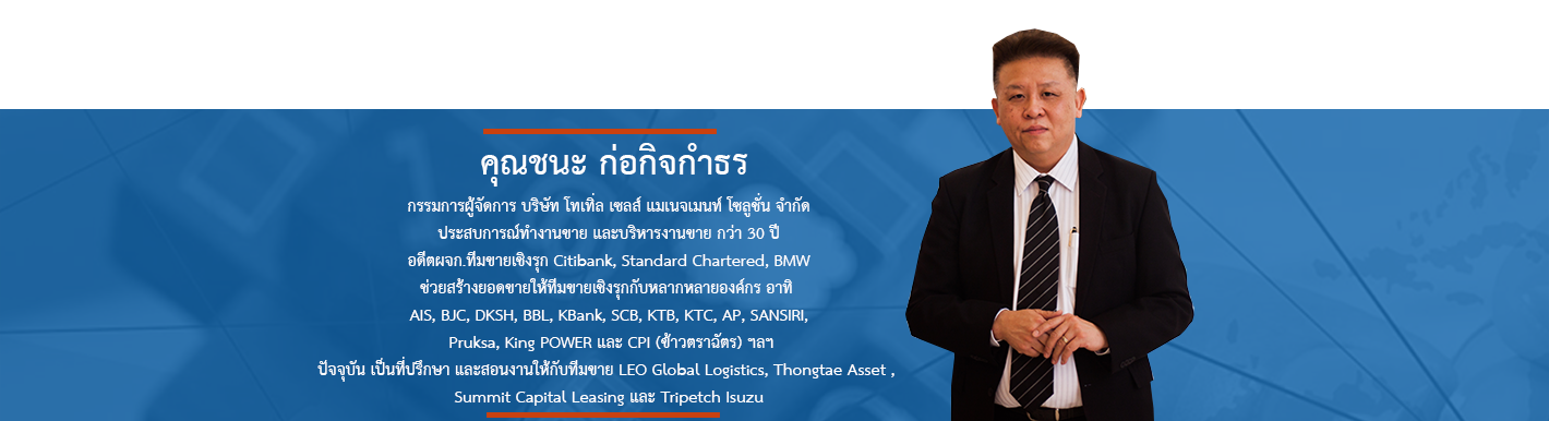 ถ่ายทอดโดย กูรู ผู้คร่ำหวอดในวงการด้านการขาย ที่ปรึกษาด้านการสื่อสารการขายและบริหารงานขาย ที่มีประสบการณ์กว่า 30 ปี ในการพัฒนาระบบงานขายและเพิ่มประสิทธิภาพทีมขายให้กับองค์กรชั้นนำทั้งในและต่างประเทศ