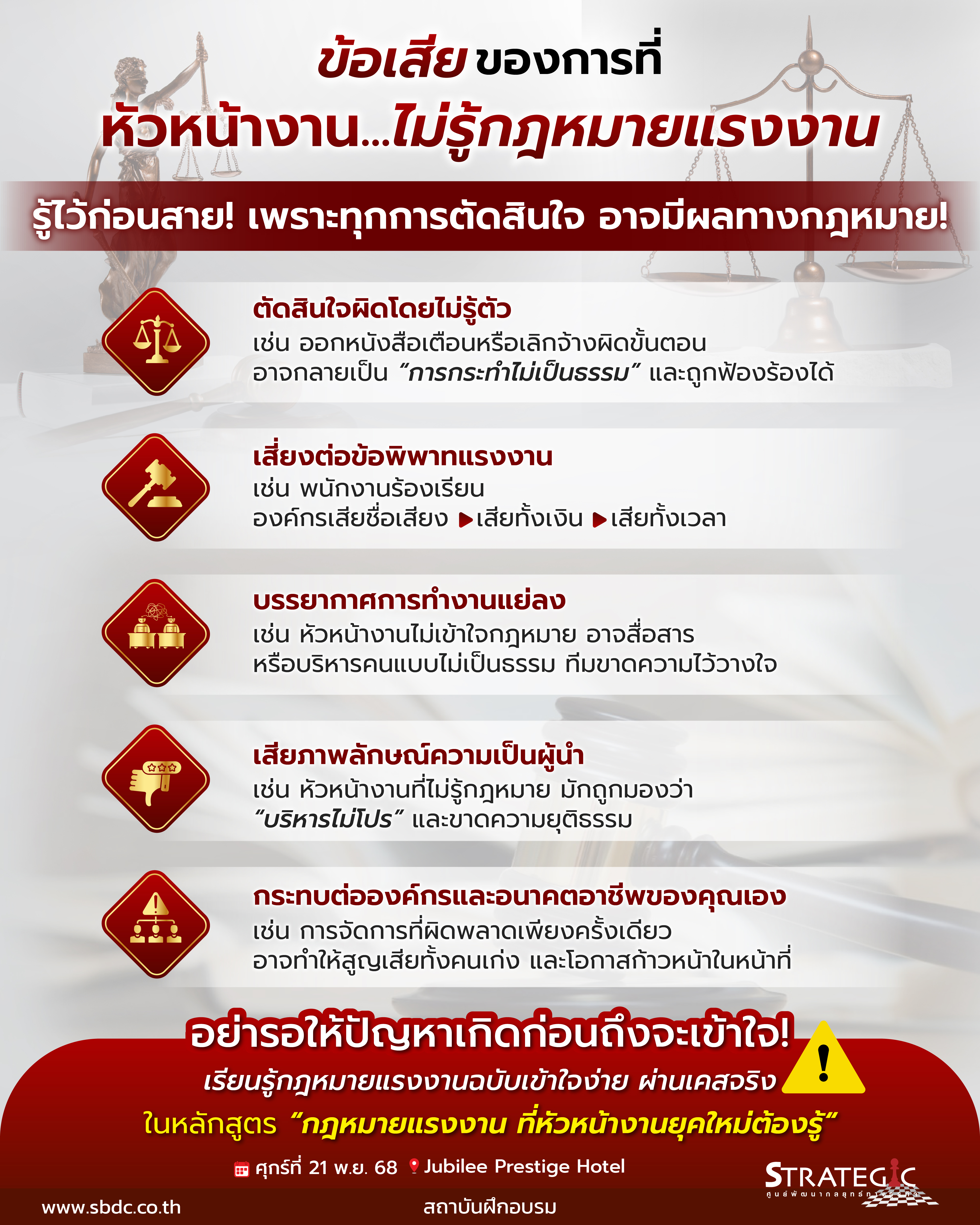 โพสต์เมื่อ 12 พฤศจิกายน 2568เป็นหัวหน้างานที่ไม่รู้กฎหมายแรงงาน ไม่ได้แค่เสี่ยง…. แต่อาจทำให้องค์กรต้องชดใช้ในสิ่งที่แก้ทีหลังไม่ได้