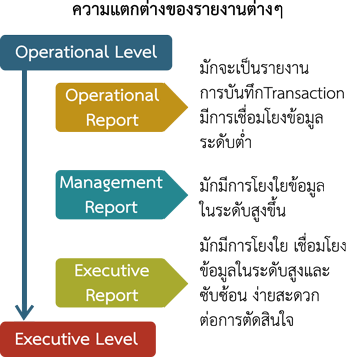 ท่านจะได้ทราบ เข้าใจถึงปัญหาและอุปสรรคที่จะเกิดขึ้น ไม่ว่าจะเป็นความถูกต้องของฐานข้อมูล ระยะเวลาที่เหมาะสม ความเข้าใจในพื้นฐานของรายงานในระดับต่างๆ และให้คำแนะนำในการนำเสนอรายงานตั้งแต่ชั้น Operation ได้