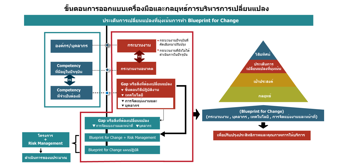 Blueprint for Change เครื่องมือหนึ่งที่นํามาใช้ในการเสริมสร้างและยกระดับขีดสมรรถนะขององค์กร (Organizational Capability) ไม่ว่าจะเป็นการ เปลี่ยนแปลงวิธีการทำงาน, Competency ของคนให้สอดคล้องกับวิธีการทำงาน, การจัดการองค์ความรู้ในที่ทำงาน และวัฒนธรรมขององค์กร ให้สามารถรองรับกลยุทธ์ (Strategic Formulation) ที่วางไว้นำไปสื่อสารถ่ายทอดลงสู่การปฏิบัติ (Strategic deployment / Execution) ให้เกิดผลตามที่คาดหวังได้ ภายใต้การเปลี่ยนแปลงที่รวดเร็วและพร้อมรับกับความเสี่ยงที่จะเกิดขึ้นได้